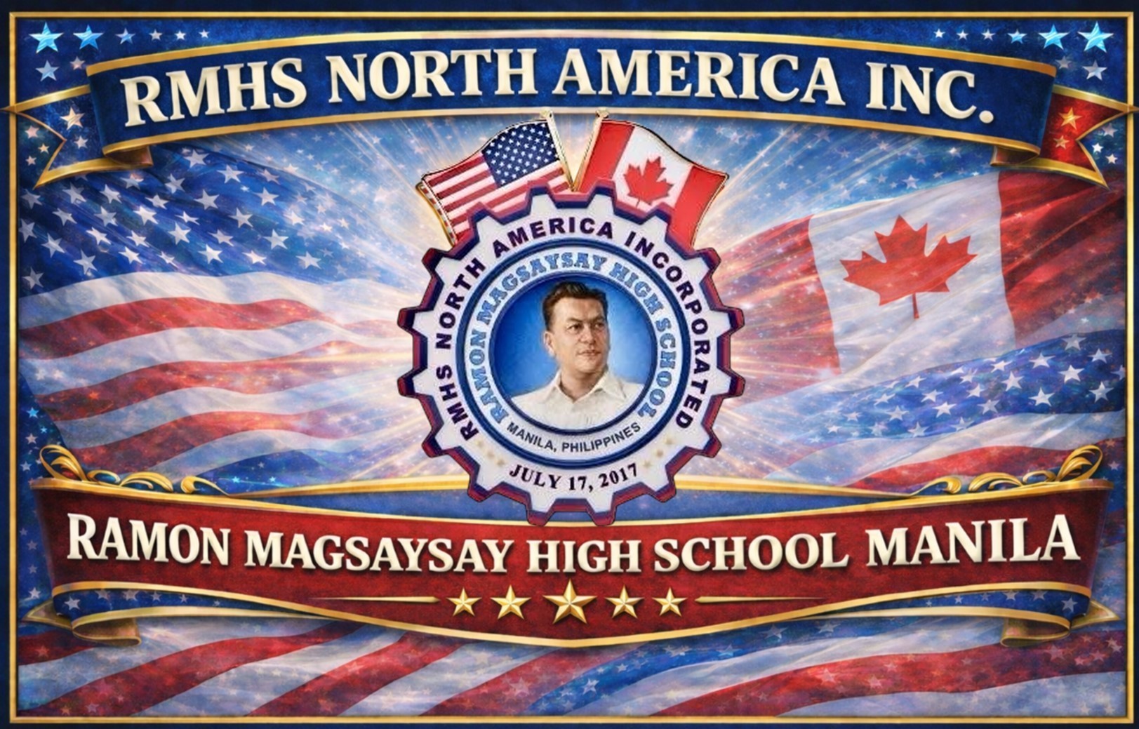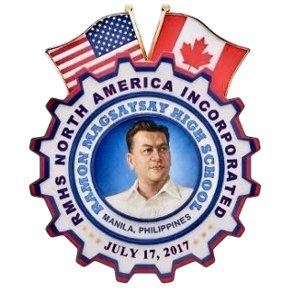 The United States and Canadian flags symbolize the organization’s North American presence and the global journey of its alumni, honoring the countries that have become home while remaining rooted in Filipino heritage. The inscription “Ramon Magsaysay High School” affirms loyalty to the alma mater, while “RMHS North America Incorporated” conveys legitimacy, structure, and long-term vision.