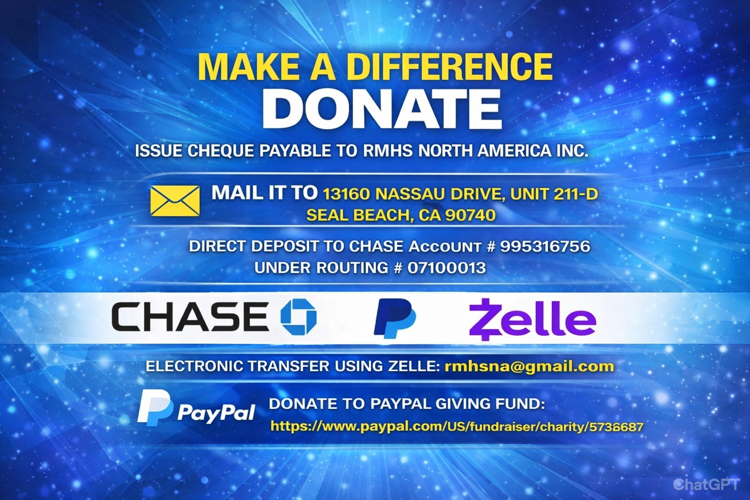 Any financial donations or payments from US & other International countries send email notification at rmhsna@gmail.com. Kindly send cheque payment payable to RMHS North America Inc. and mail it to Ms. Anastacia Wayman at 13160 Nassau Drive, Unit 211-D Seal Beach, CA 90740 or direct deposit to CHASE Account # 995316756 under Routing # 071000013. You can send your donation by etransfer using Zelle: rmhsna@gmail.com or donate to PayPal Giving Fund: https://www.paypal.com/US/fundraiser/charity/5732687